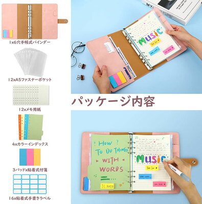システム手帳 バインダー ファイルフォルダー リングバインダー A5サイズ 6穴 PUレザー材質 ファスナーポケット付き ラベル付き ペンホルダー付き カードスロット付き 付箋付き 横罫線リフィル付き 防水 不透明 多機能 オフィス用品 書類入れ ルーズリーフファイル